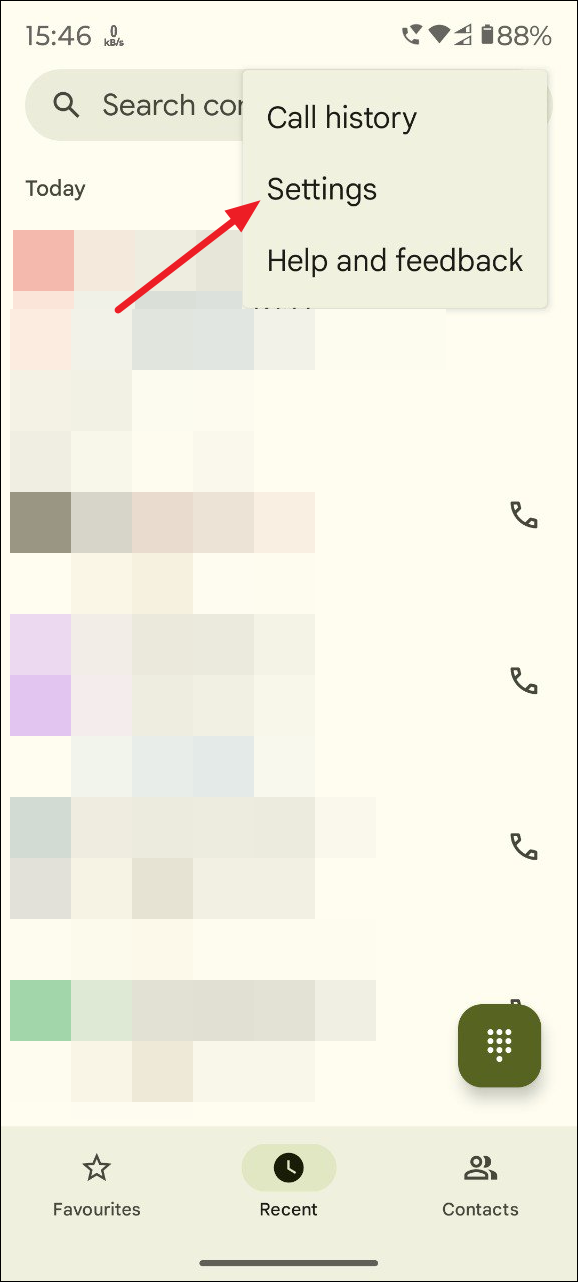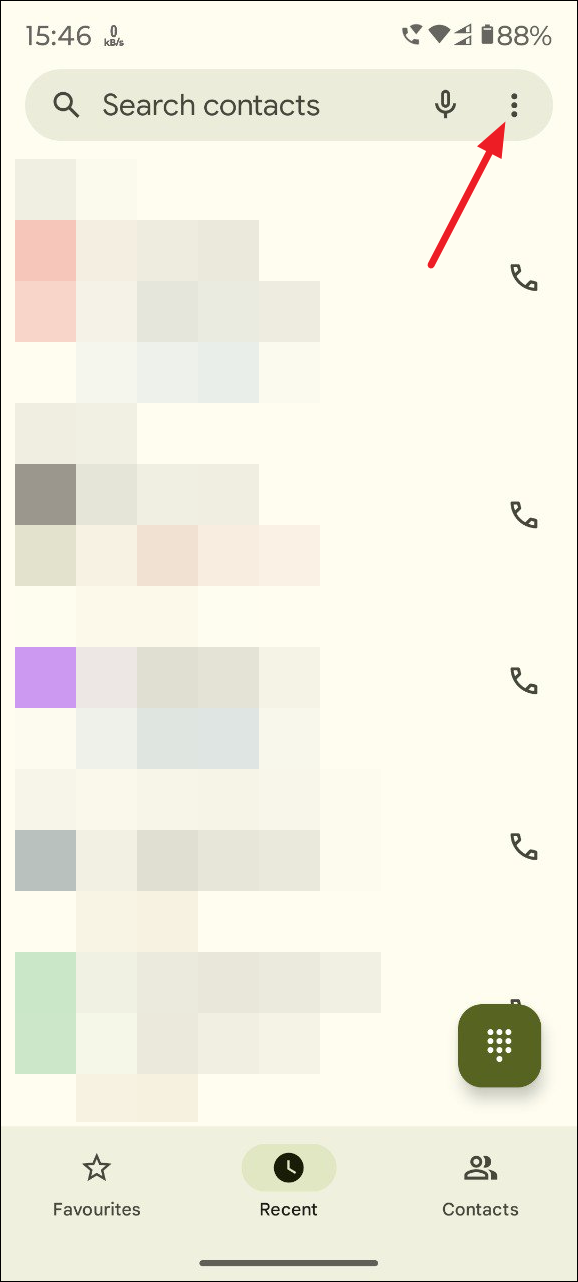 - Open the Phone app or dialer and tap on the three vertical dots in the top right.