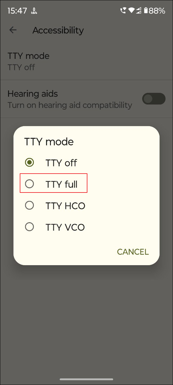 - A pop-up will appear, showing you the different TTY modes you can activate. Tap on the one you want to use. To allow both participants to send typed messages, I recommend using the TTY Full option.