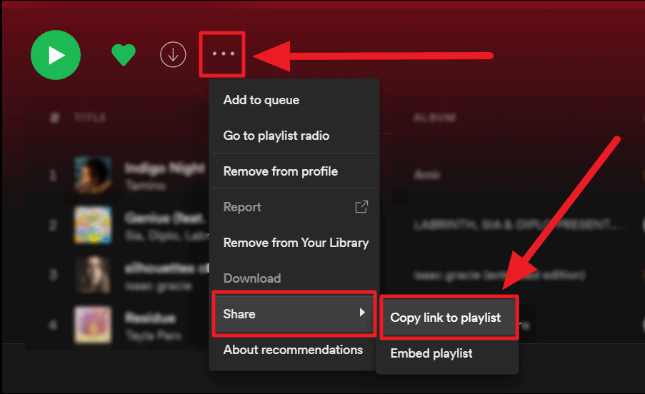 Sharing your Blend playlist on your computer. Click the ellipsis icon (three horizontal dots) below your Blend playlist’s credentials. Select ‘Share’ from the drop-down menu, and then click on ‘Copy link to profile’.