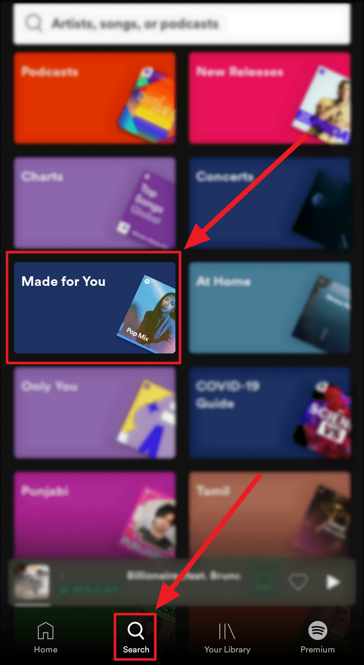Launch Spotify on your phone and tap the ‘Search’ button (magnifying glass icon) at the bottom of the screen. Then, scroll to find and select the ‘Made for you’ block.