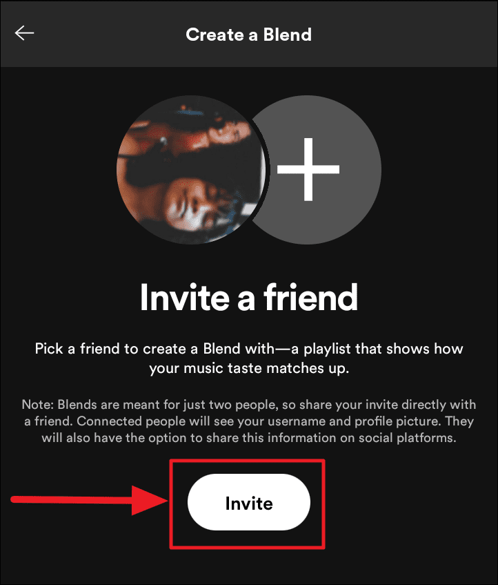 You will now be on the ‘Create a Blend’ page, with an ‘Invite a friend’ section. Here, you will see your own profile image next to a circular space with a plus sign (+) – this one’s for the profile image of the user who joins your blend.