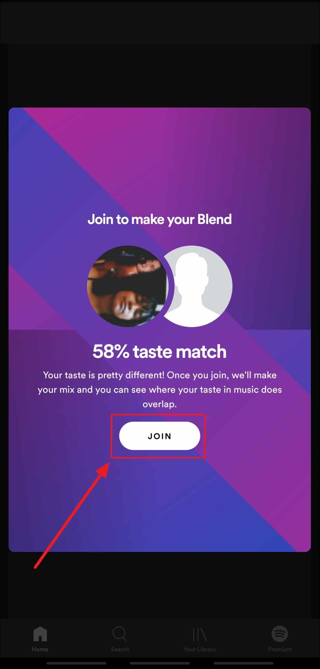 When the other person (or if you’re the other person) taps on your Blend request, a ‘Taste Match’ screen would greet them. Here, Spotify calculates and reveals the percentage of similarity in musical tastes between you and your Blend partner. They will now need to hit the ‘Join’ button to join the Blend.