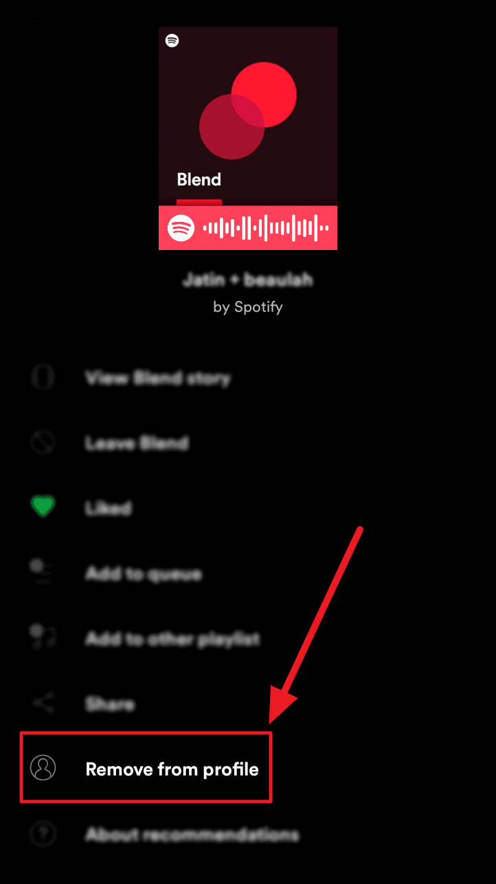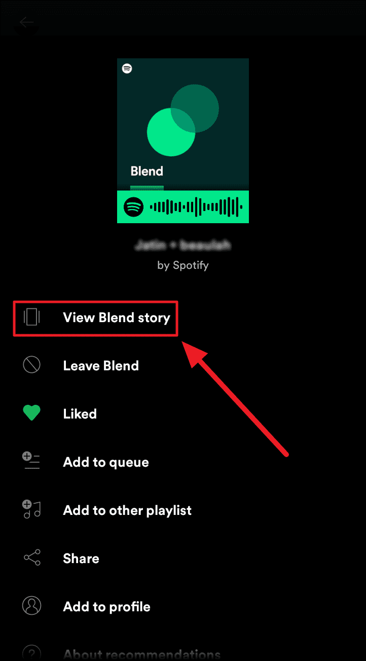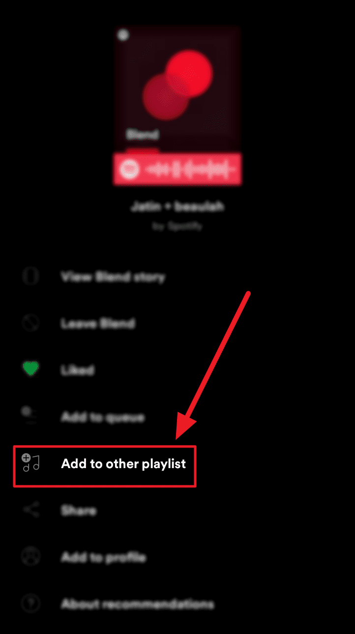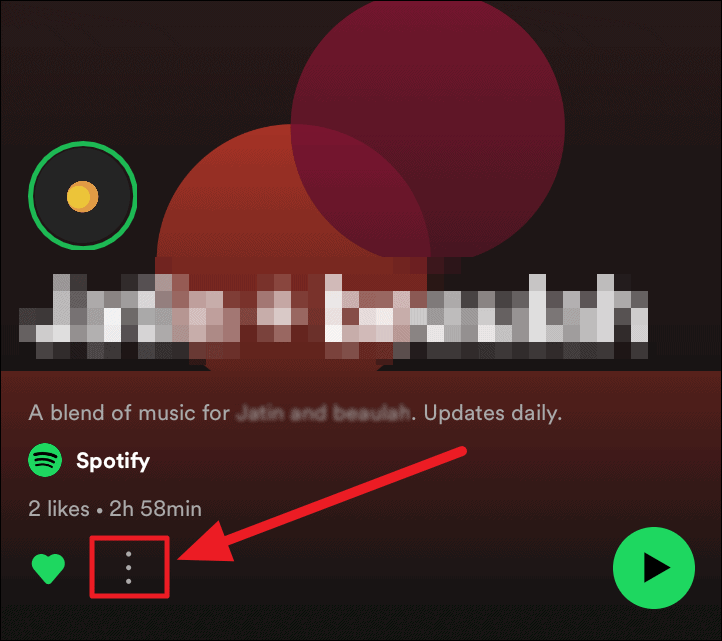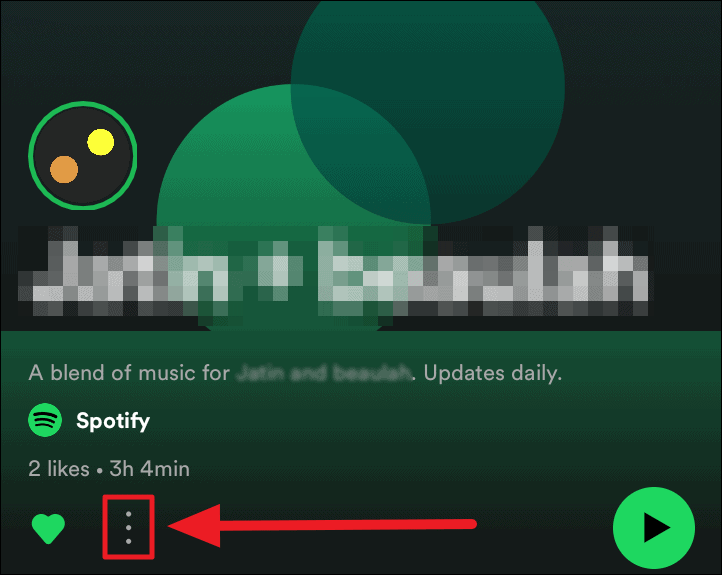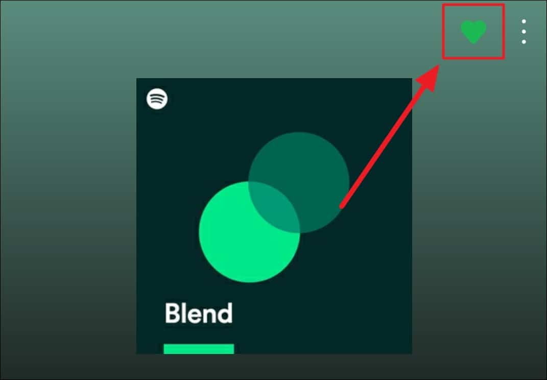 Another way is to tap the ellipsis icon (three vertical dots) next to the green heart (like button – green if liked, colorless if not), below the credentials of the Blend playlist.