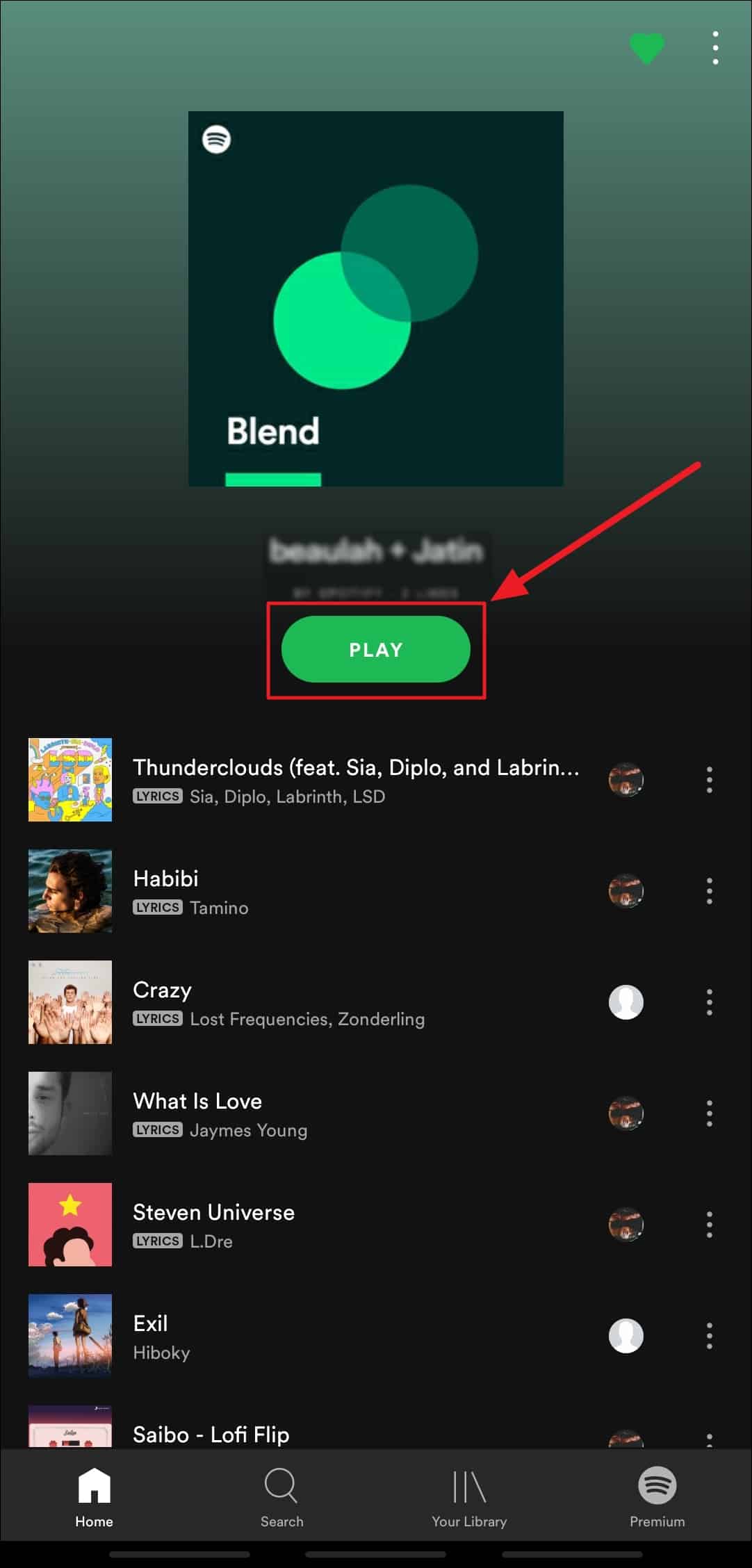 Both Blend partners will now see a merged playlist containing songs from both interests. To enjoy this mixed playlist, hit the ‘Play’ button. You will notice some new songs outside either playlist. These are Spotify’s additions based on your listening activities.