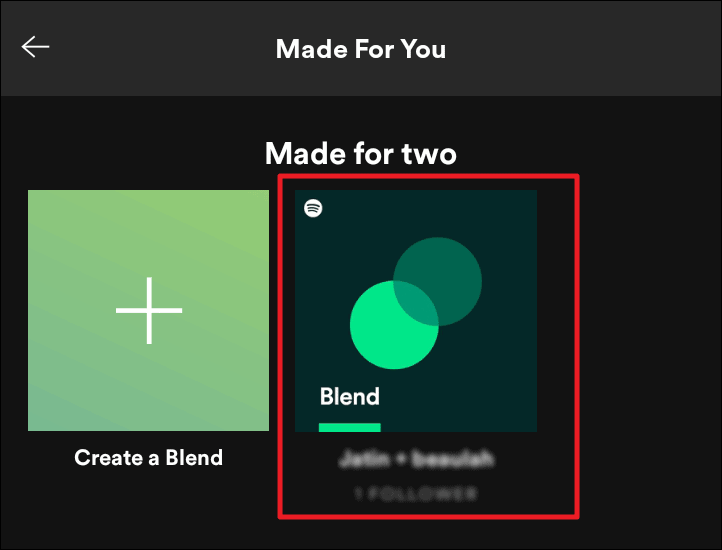 But, if you don’t like your Blend playlist or unlike it by tapping the green heart, then you can find the Blend playlist in the ‘Made for two’ block (follow the same procedure as discussed before to create a block to find your Blend playlist). Here, you will find your blend playlist(s) next to the ‘Create a Blend’ block.