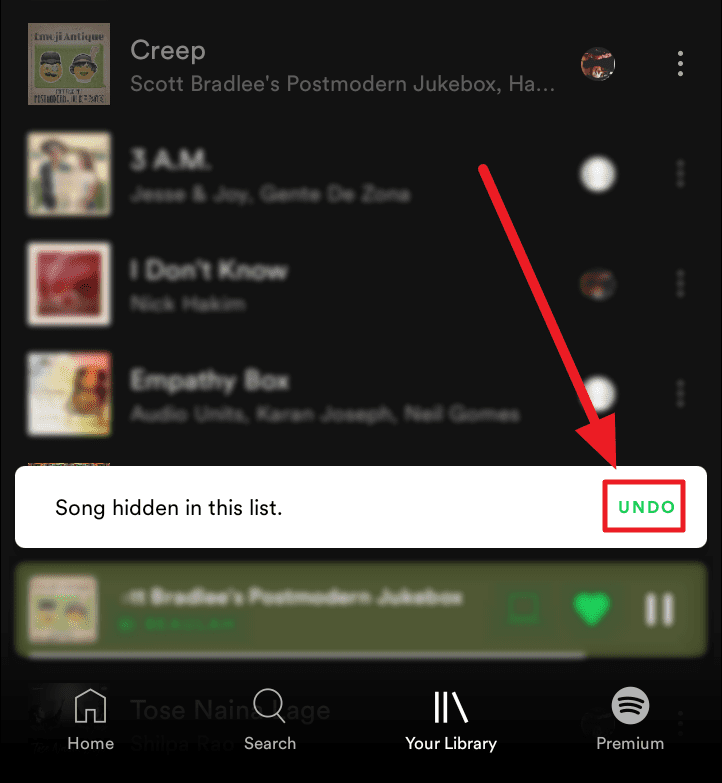 The song will blur a little once it is hidden. You will receive a notification saying ‘Song hidden in this list’. You can choose to undo the hiding on this notification by tapping the ‘UNDO’ button to the right of the notification message.