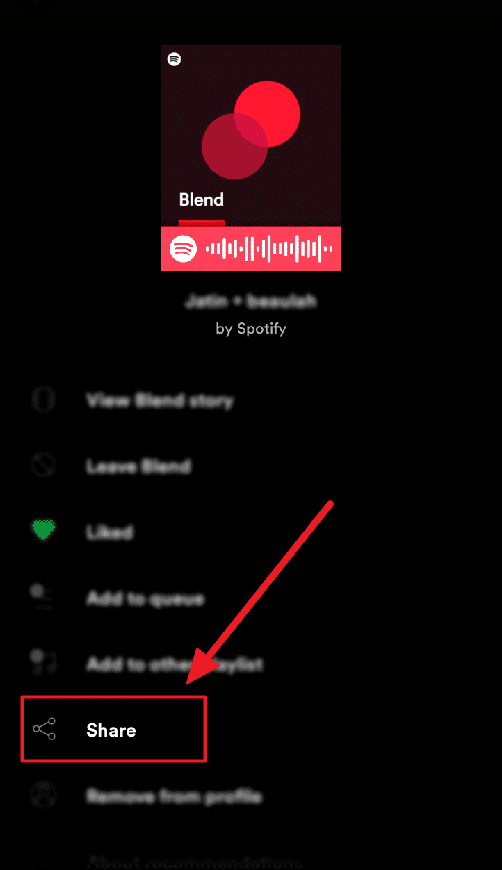 Sharing your Blend playlist on your phone. Tap the ellipsis icon (three vertical dots) below the duo name of your Blend Playlist.