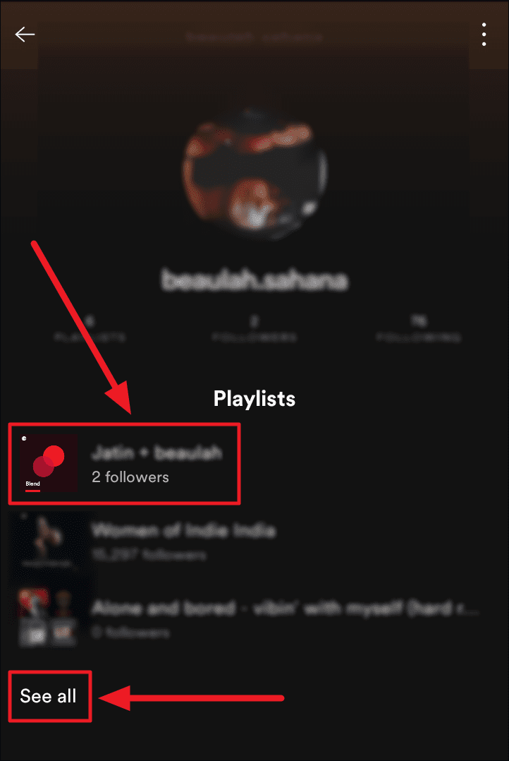 If you see the Blend playlist you want to remove on your profile page, long tap on the playlist to open its menu. If you don’t see the playlist here, tap ‘See all’ below the list of 3 playlists to have a full view of all your playlists – where you can choose the Blend playlist.