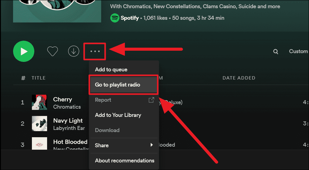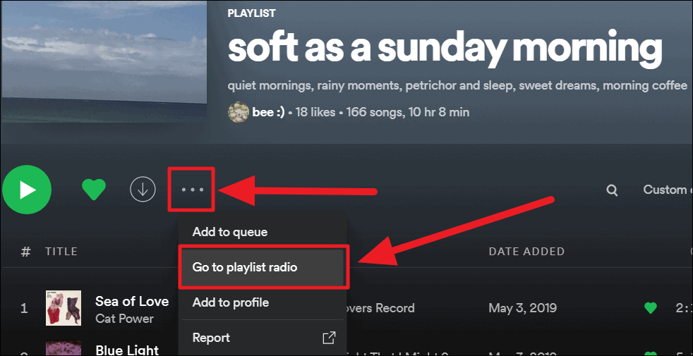 For playlists. To find more music like the items in your current favorite playlist, first, open your favorite playlist. Then, click the ellipsis icon (three horizontal dots) below the playlist’s info.