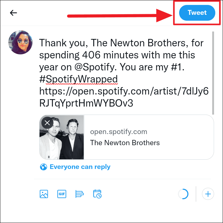 This Tweet is pre-formatted along with a Spotify link to your top artist’s profile. You can customize the content of this tweet, and once you’re done, hit the ‘Tweet’ button.