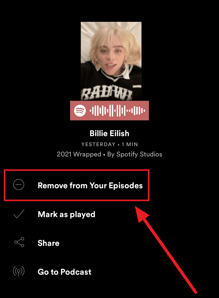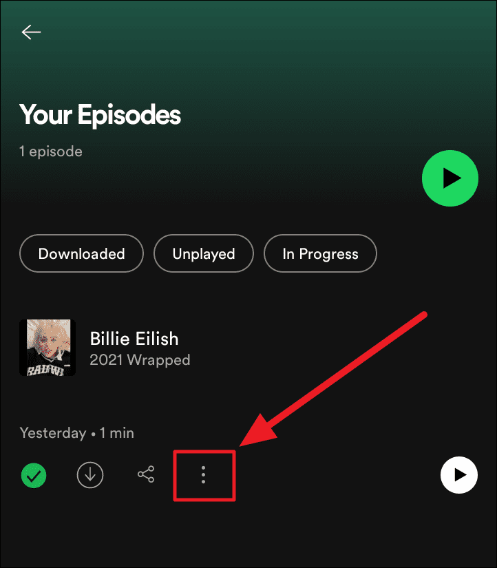 All your saved and downloaded episodes will be on the following screen. To remove the artist video from Your Episodes, click the ‘ellipsis’ icon (three vertical dots) below the title of the episode.