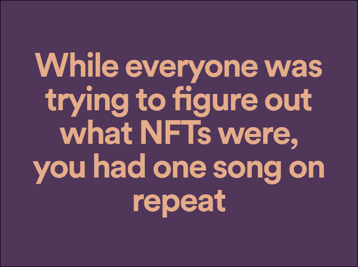 NFT or Non-Fungible Token became the popular talk of the world during early 2021. While this was running in mainstream media both online and offline, and people were figuring out what it was, we, Spotify-ers were busy listening to some impeccable tunes. Spotify highlights our favorite song during one of this year’s crucial periods of learning. Check out what you were doing during the NFT rage. It may be a nostalgic turn.