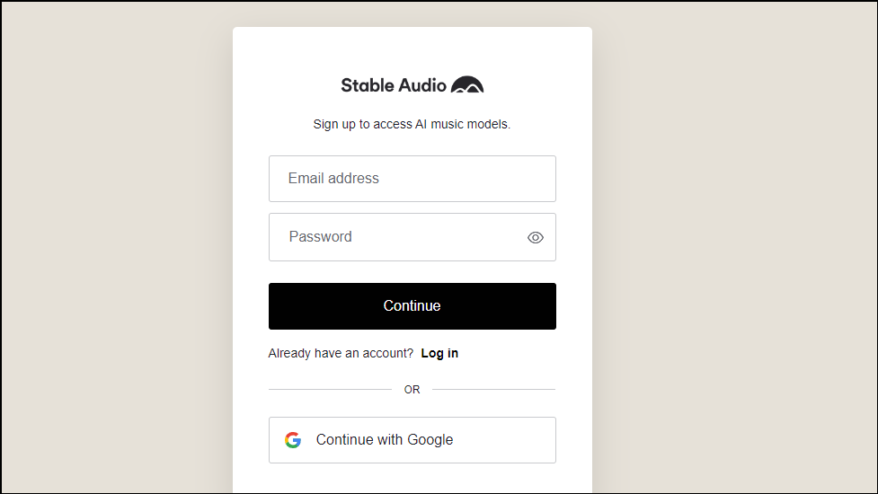 - Clicking the button will take you to a new page where you can create an account which is required for using the Stable Audio AI. You can either set up a new account by entering your email address and a password or login through your Google account.