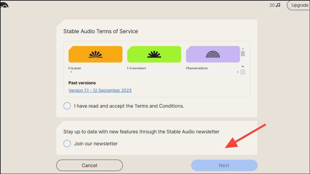 - Once you are signed in, you will be greeted by the home page of the Stable Audio AI platform. This will contain the terms and conditions that you will have to accept to proceed. You can also choose to sign up for the Stable Audio newsletter from here.