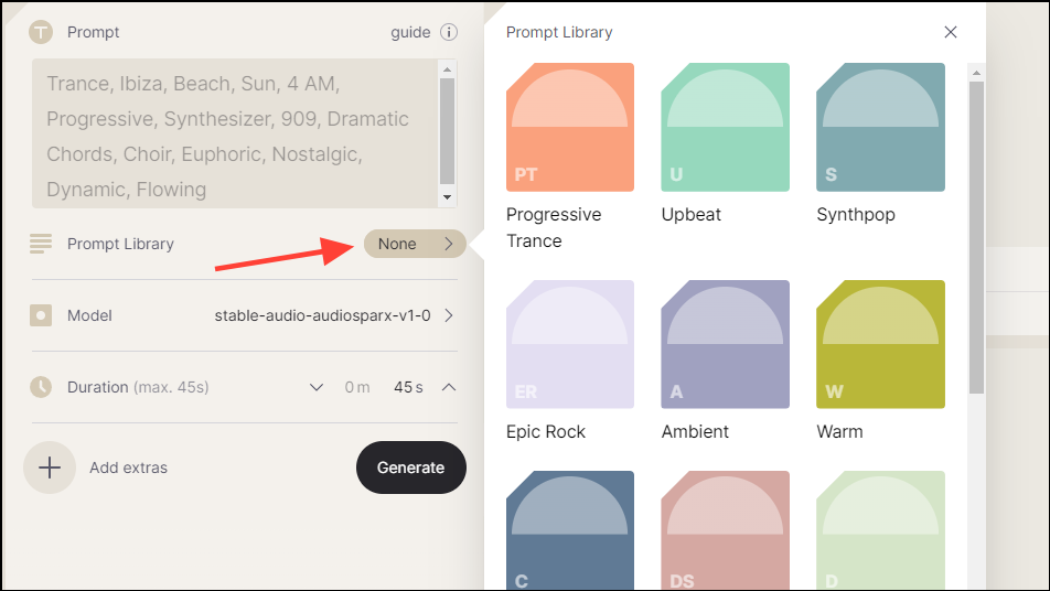- Another way to generate audio is to use ready-made prompts from the 'Prompt Library' located below the prompt section, where you can access different audio prompt styles. To do so, click the capsule-shaped button labeled 'None'. This will open the library, which contains various styles you can choose from to add to your audio.