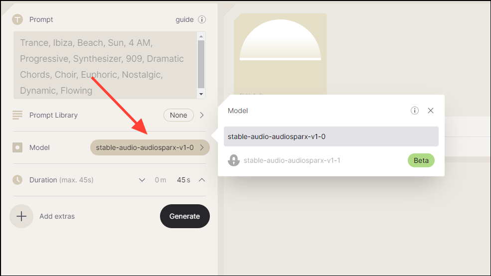 - Underneath the 'Prompt Library', you can see the AI Model used for the audio generation process. Clicking on the model name, in this case, 'Stable-audio-audiosparx-v1-0', will show all available models. There is only one additional model available right now, which is in Beta.