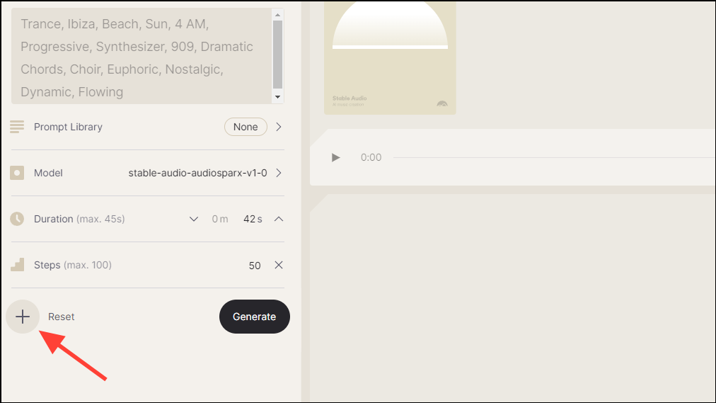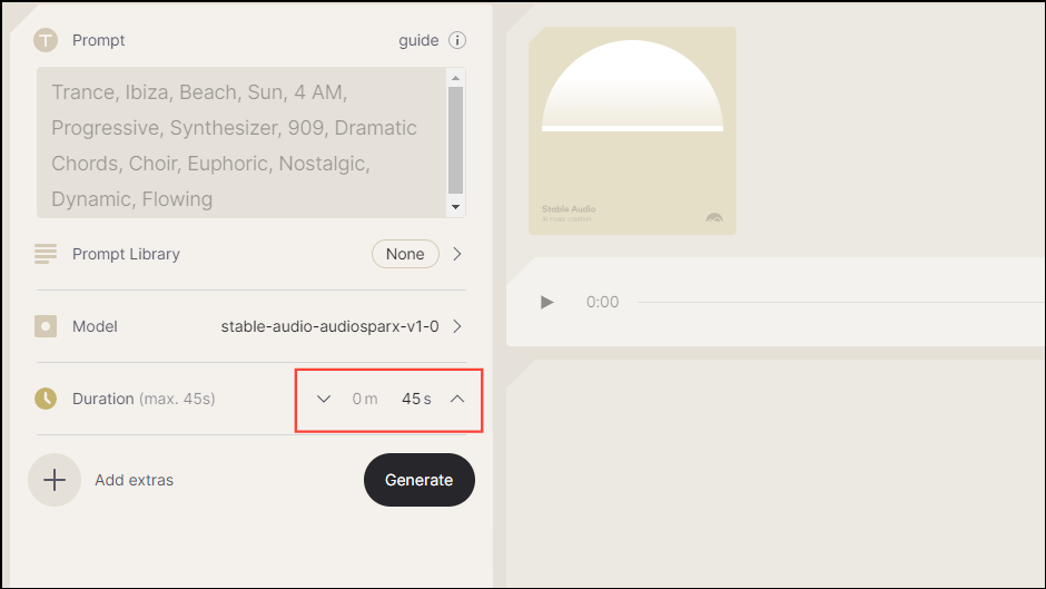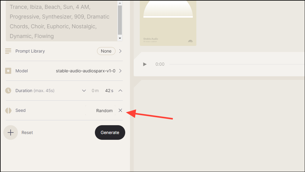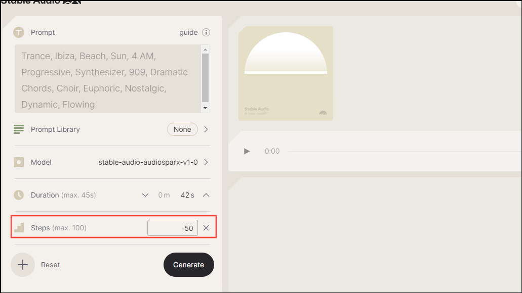 - Once you're done, click the 'Generate' button, and Stable Audio will start generating your audio. Alternatively, you can remove the steps and use another of the extras, such as the 'Seed' option, which controls the randomness of the audio generation.