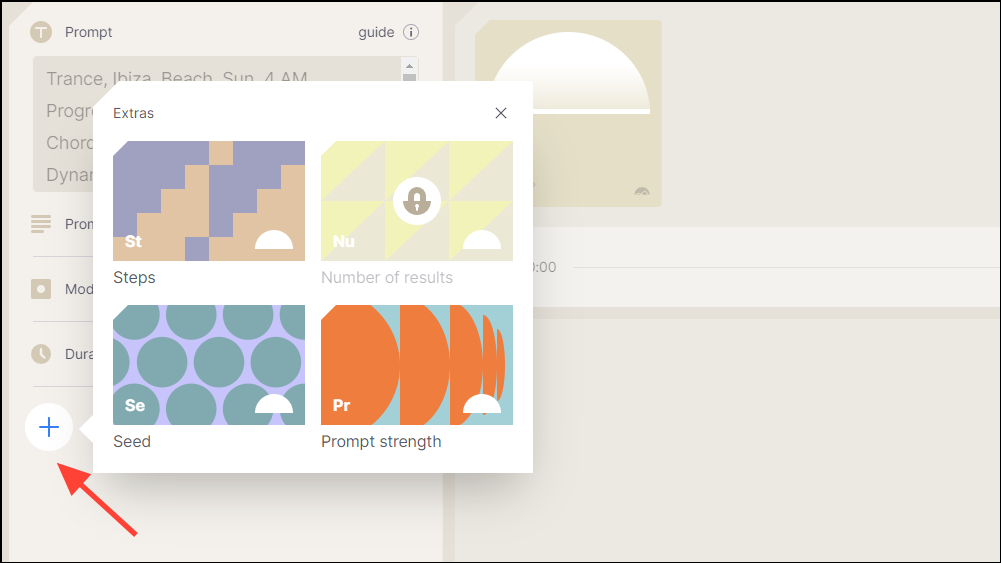 - The last item on the left side is the option 'Add Extras' that you can use to customize your audio. Click the '+' button to view the available options, which currently include 'Steps', 'Number Of Results', 'Seed', and 'Prompt Strength'.