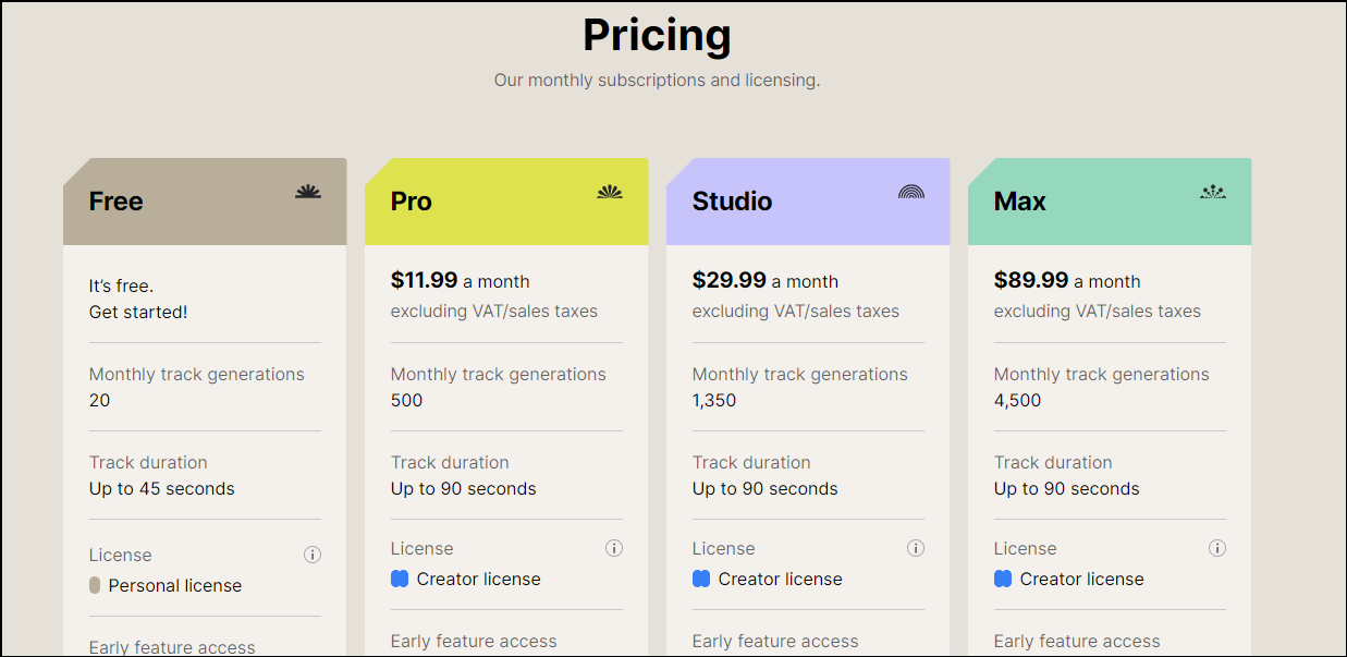 - Clicking the 'Upgrade To Pro' button will show you the available pricing plans. Besides the free plan, you can choose between the Pro, Studio, and Max plans that cost $11.99/month, $29.99/month and $89.99/month respectively. The 'Free' plan allows generating 20 tracks per month, while the 'Pro' allows 500 tracks. This goes up to 1,350 with the 'Studio' plan and 4,500 with the 'Max' plan.