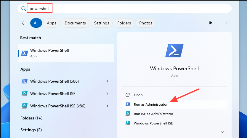 - When the PowerShell window opens, type the following inside it and press Enter: