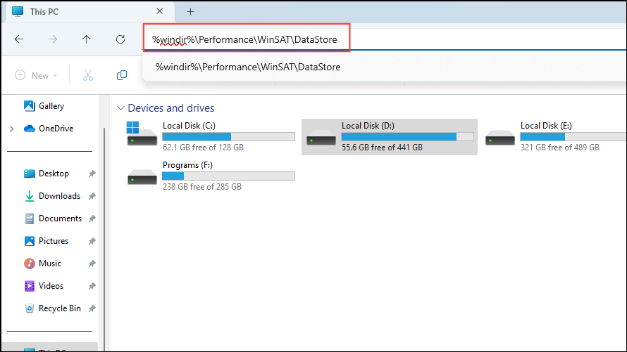 Win + Rshortcut and type%WINDIR%\Performance\WinSAT\DataStoreinside it before pressing Enter.