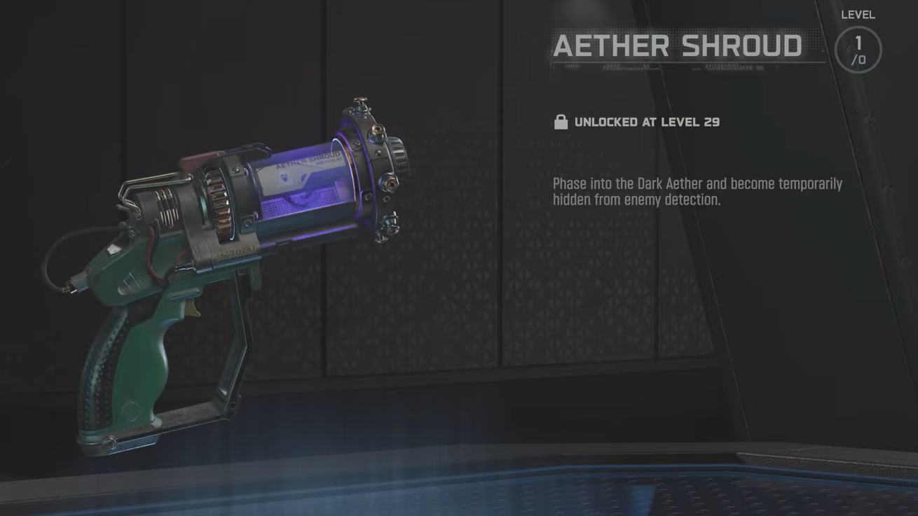 | Aether Shroud | Field Upgrade | 48 | Temporarily phases you into the Dark Aether, making you invisible to enemies and letting you escape death or reposition. |