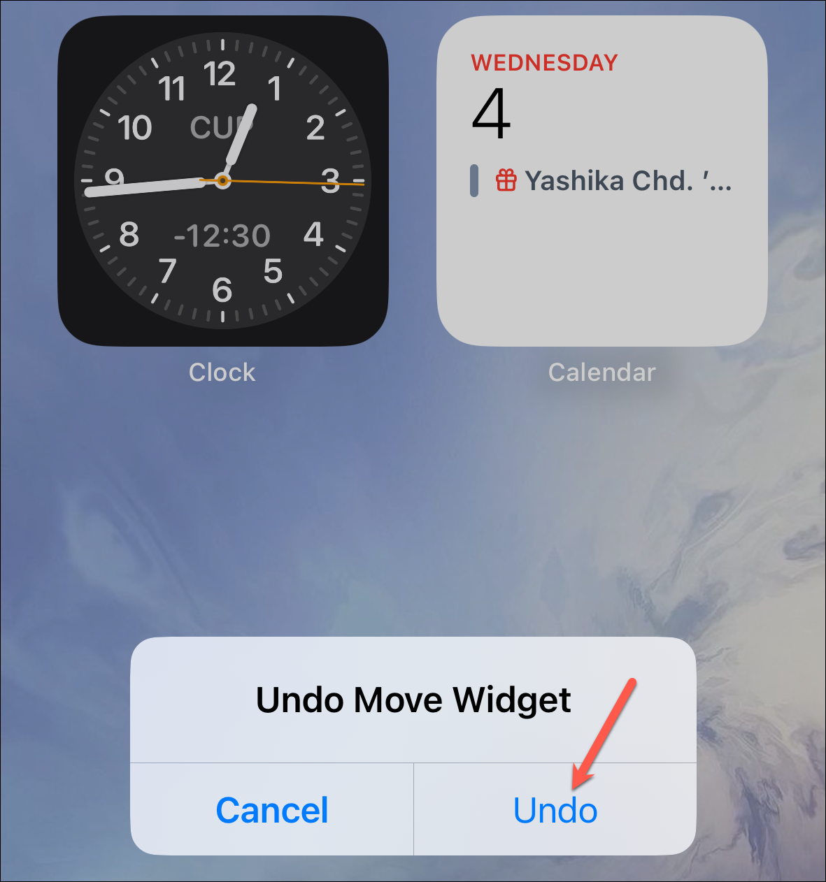 The layout of the Home Screen will revert to what it was before. Note that this only works for widget movement, and it cannot undo the placement of a new widget or the deletion of one.
