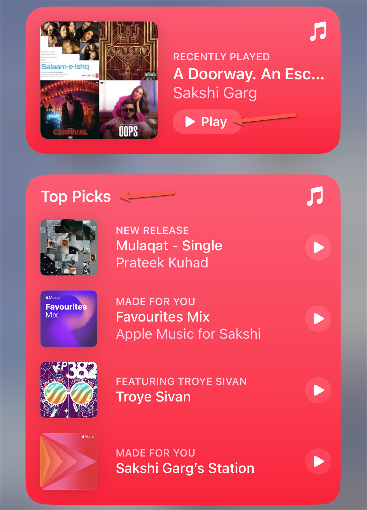 Music widget. Apart from being able to play/ pause music from the Music widget, you can now see a list of top charts as well as personalized recommendations (for subscribers) in the widget itself instead of just Recently Played music.