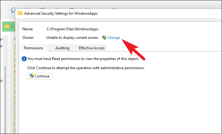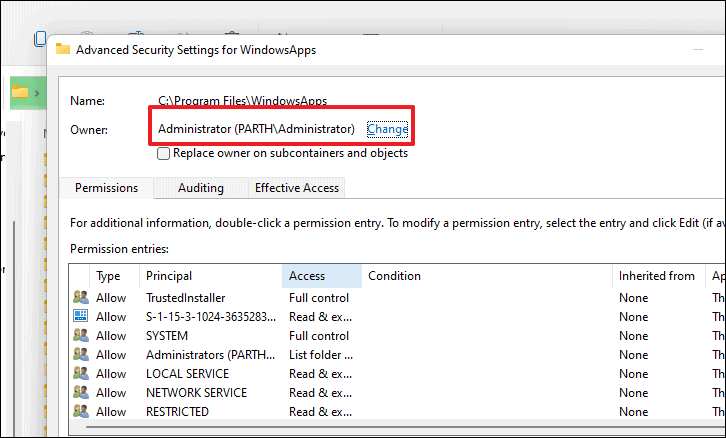 Then, from the ‘Advanced Security Settings’ click on the ‘Change’ button present right next to the ‘Owner’ label. This will open the ‘Select User or Group’