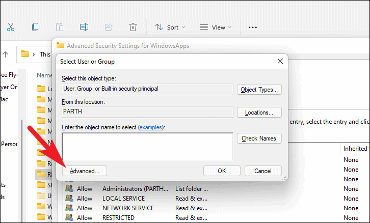 After that, from the ‘WindowsApps Properties’ window, click on the ‘Advanced’ button to tweak the permissions for accessing the folder. This will again open a separate window on your screen.