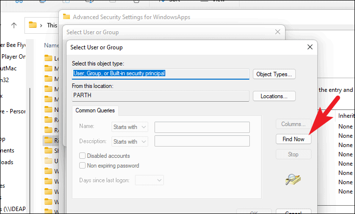From the ‘Select User or Group’ window, click on the ‘advanced’ button present at the bottom left corner of the windowpane. This action will again bring up a separate window.