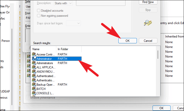 After that, select your username/account name from the list and click on the ‘OK’ button to select the user and close the window.