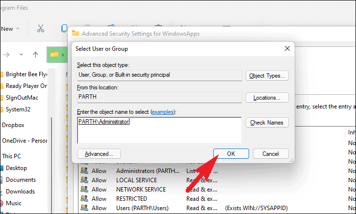 Next, on the ‘Select User or group’ click on the ‘OK’ button again to change the owner of the ‘WindowsApps’ folder and close the window.