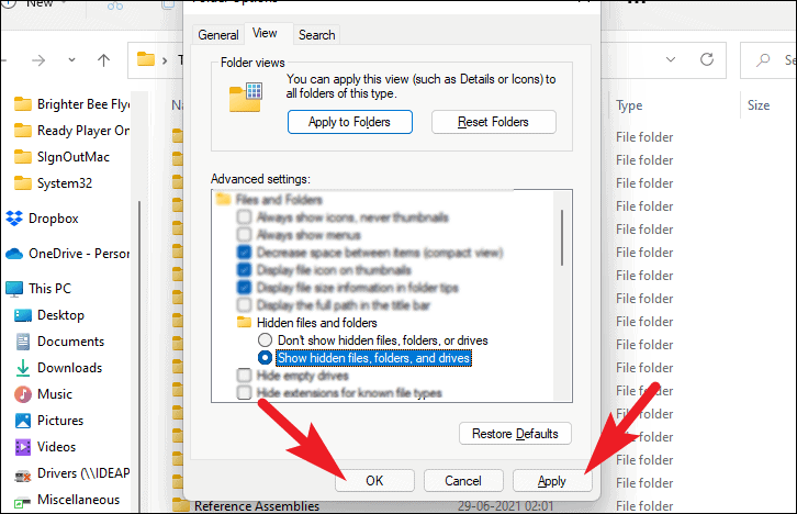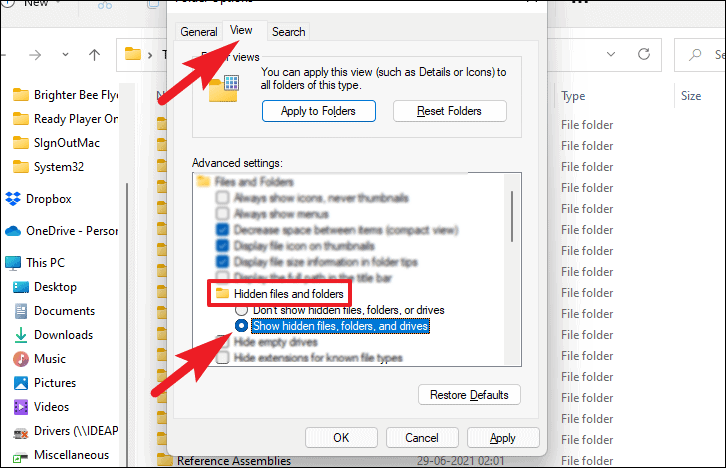 From the separately opened window, click on the ‘View’ tab and locate the ‘Hidden files and folders’ option under the ‘Advanced settings:’ section. Then, click on the radio button preceding the ‘show hidden files, folders, and drives’ label.