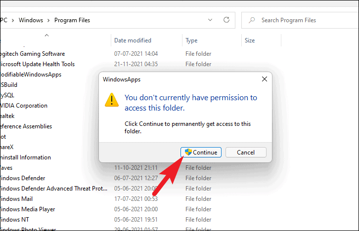 Then, a prompt will appear on your screen notifying you that you don’t have permission to access the folder. Click on the ‘Continue’ button present on the prompt.
