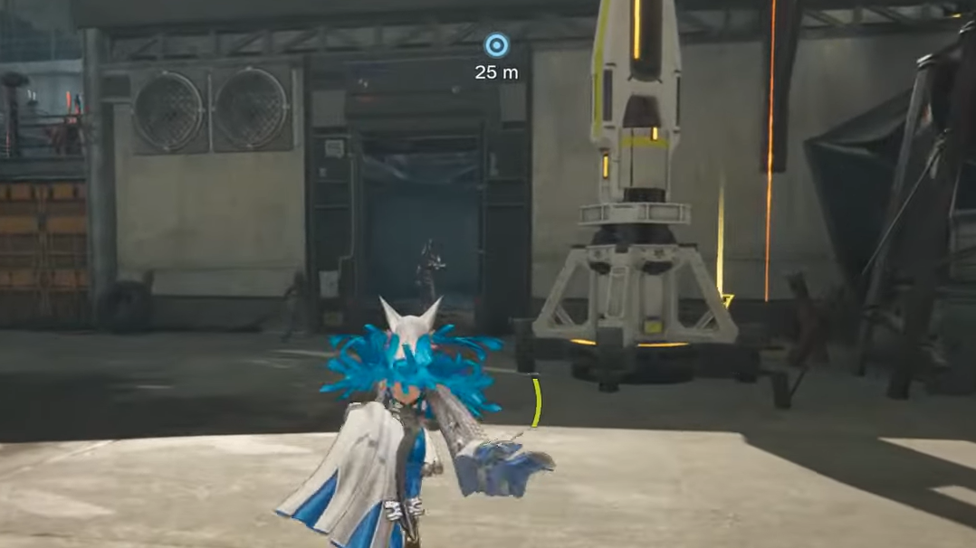 Step 1: After using the jump pad, land on the upper level above the earlier warehouse zone. The objective marker should now hover near a stack of shipping containers.
