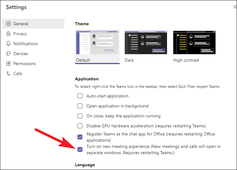 The General settings will open. Under the label, ‘Application’, go to the last setting, i.e., the option for ‘Turn on new meeting experience (New meetings and calls will open in separate windows. Requires restarting Teams.)’. Click on the checkbox to enable it and restart Microsoft Teams.