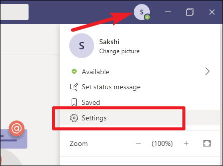 If you’ve tried to use Together Mode in a meeting but couldn’t find it, you’re not alone. Before using Together Mode, you need to enable support for it from the settings. Open the Microsoft Teams desktop client. Then click on the ‘Profile’ icon on the Title Bar and go to ‘Settings’ from the menu.