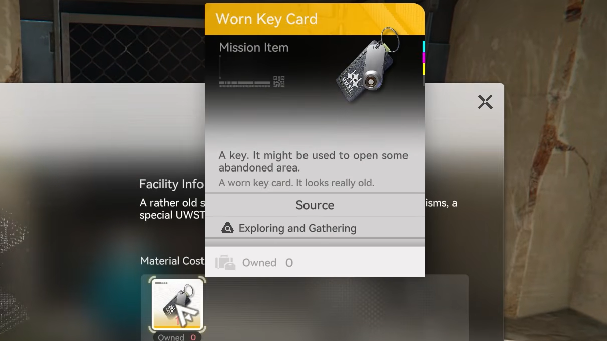 The Worn Keycard is a 5★ Mission Item. It sits in your mission inventory rather than your normal consumables, and it is not consumed in combat or crafting.