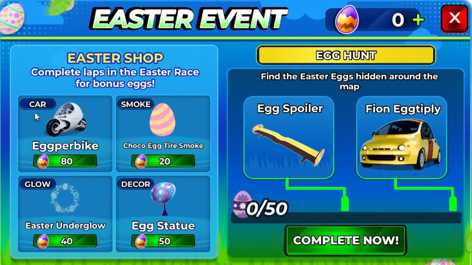 Quick answer: Collect 25 eggs to unlock the Egg Spoiler, and all 50 to earn the Fion Eggtiply Car. Eggs respawn, letting you gather extras to spend in the Easter Event Shop on items like the Eggperbike (80 eggs) and Easter Underglow (40 eggs).