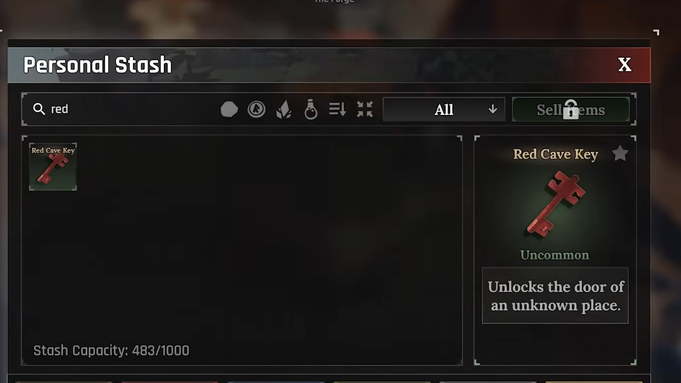 Step 4: Use the Red Cave Key on the Raven Cave entrance to unlock the red‑crystal dungeon. From this point, you can freely return to mine its ores, including the large red crystals that can contain Evil Eye.