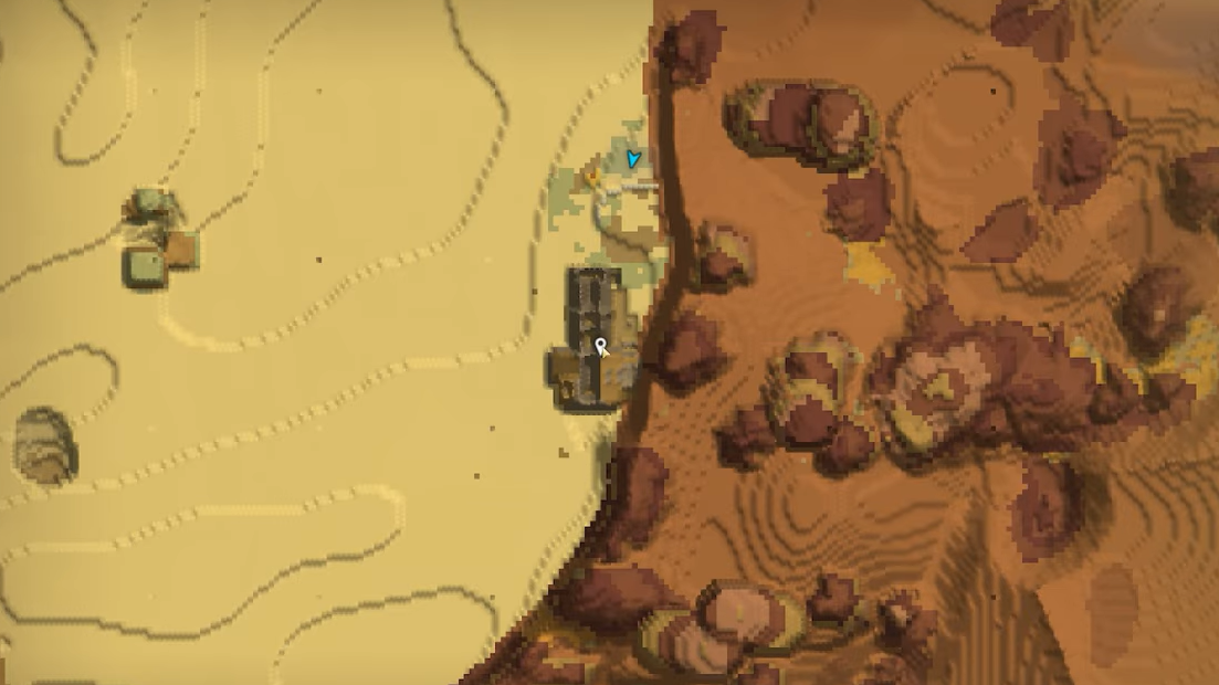 On the desert map, a distinctive T-shaped mine symbol marks man-made mining sites. These are surface structures built over ore-rich cave segments.