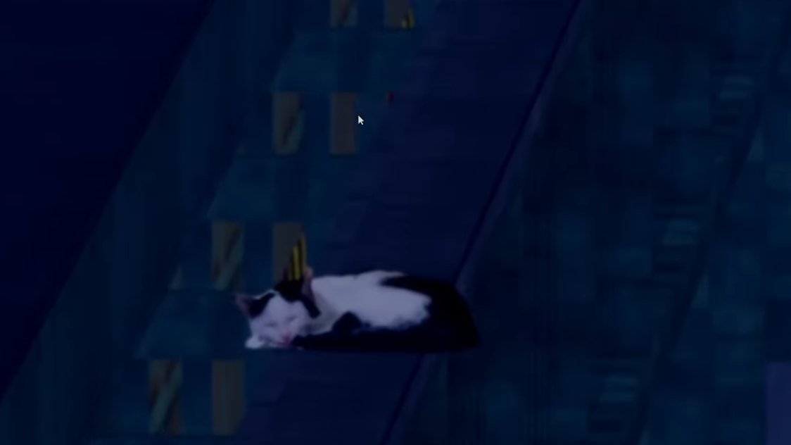 The key to finding Meowy is realizing that the cat is not on street level at all. Meowy is positioned on the train tracks directly above Power’s position, resting on the railing at the edge of the platform.