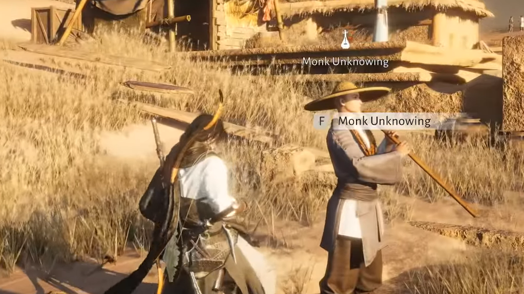The exact trigger is Monk Unknowing at Peaceward Camp. He stands near the Peaceward Camp Boundary Stone on a raised wooden platform and plays the flute.