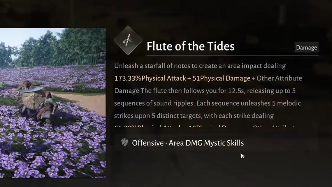 Flute of the Tides rewards you with a Mystic Skill of the same name. Its effect is a broad burst of damage followed by a summoned flute attack that keeps striking nearby enemies.
