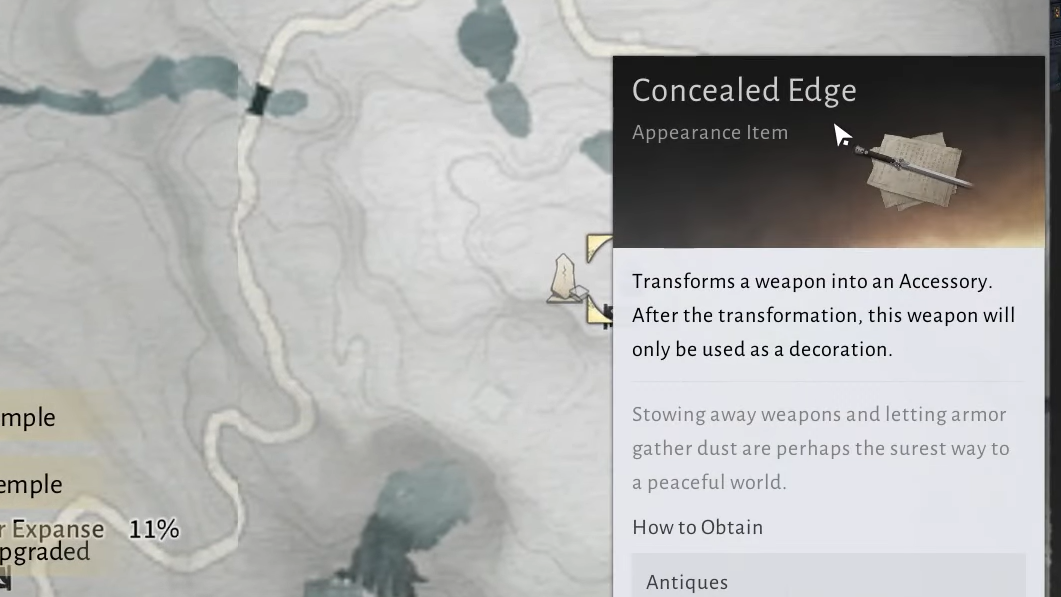 Concealed Edge is the actual gameplay reward tied to antiques. Each one is a single‑use token that converts a compatible weapon into a permanent cosmetic accessory. Right now, the items that can be turned into backpieces are a small selection of Swords and Spears, such as the Silent Edge sword and spear used in popular “double weapon on the back” looks.