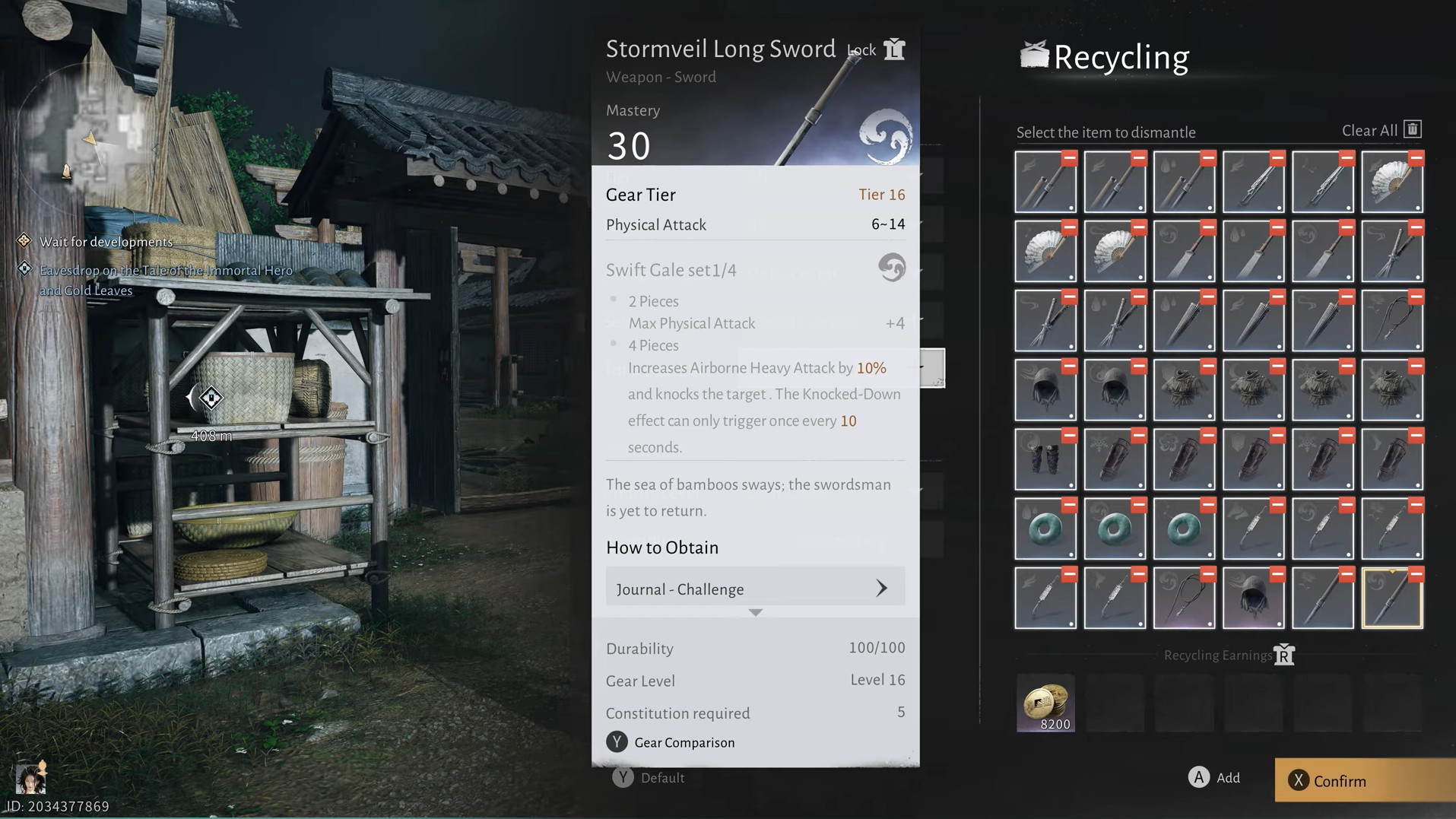 Step 3: Pick the items you want to dismantle. Equipped weapons, armor, and accessories never appear in the recycling list, so there is no risk of scrapping currently worn gear by mistake.