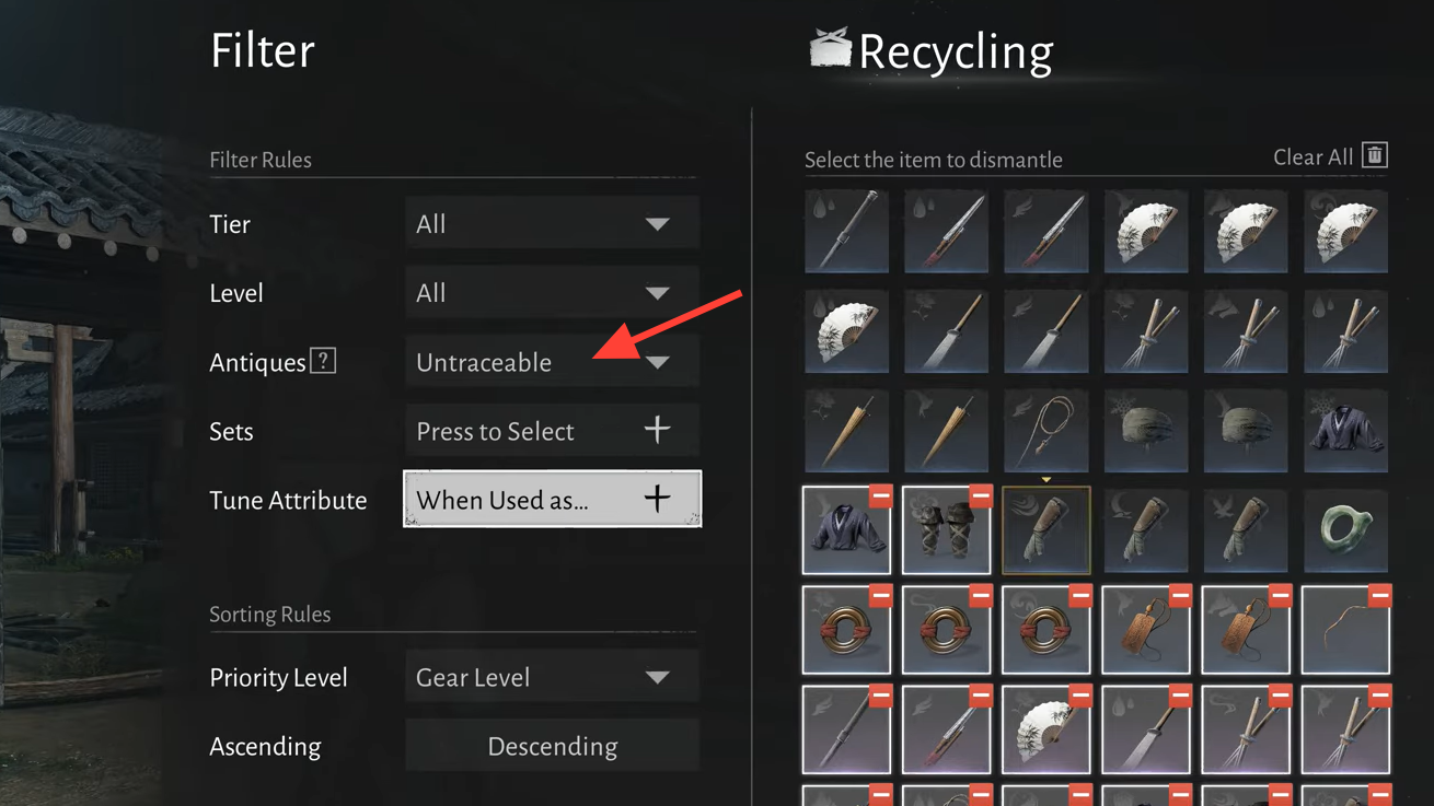 Step 3: Select only the untrace items when you want to clear space. These pieces have no role in Tuning and are safe to destroy for coins.