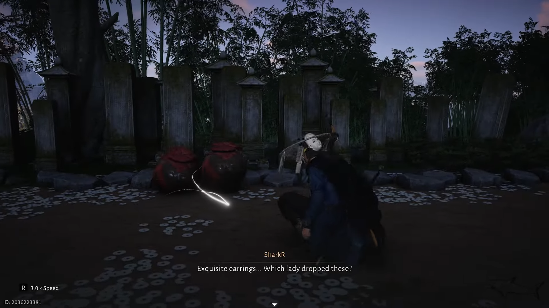Step 2: Search the ground near these tombs for a small glowing item described as a missing earring. When you stand in the correct spot, an interaction prompt appears (default key F) to pick up the earring.