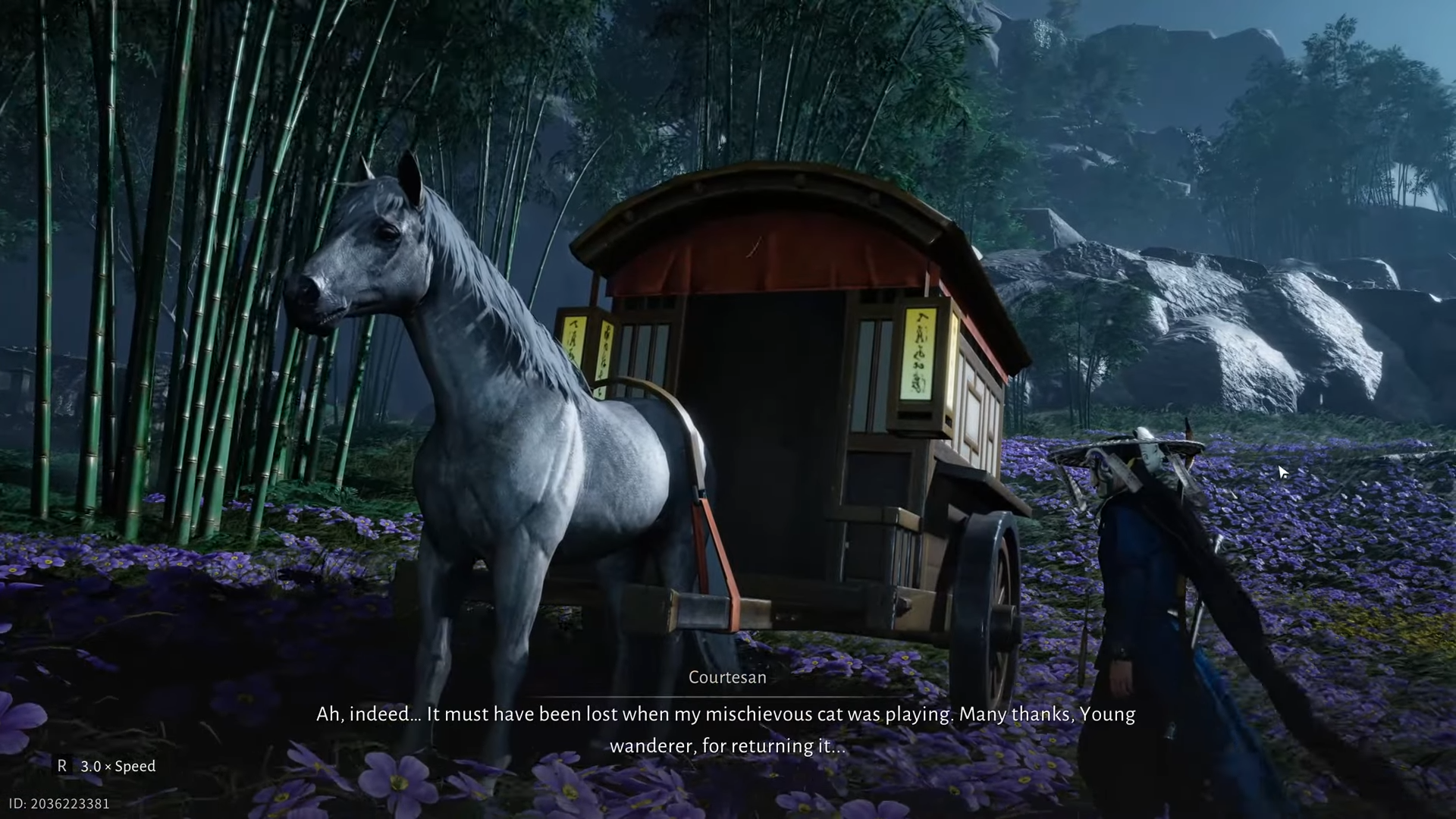 Step 3: After you pick up the earring, walk back down toward the Flower Expanse road below the cliffs. A horse carriage caravan with a courtesan inside will appear at a fixed point near the fields.